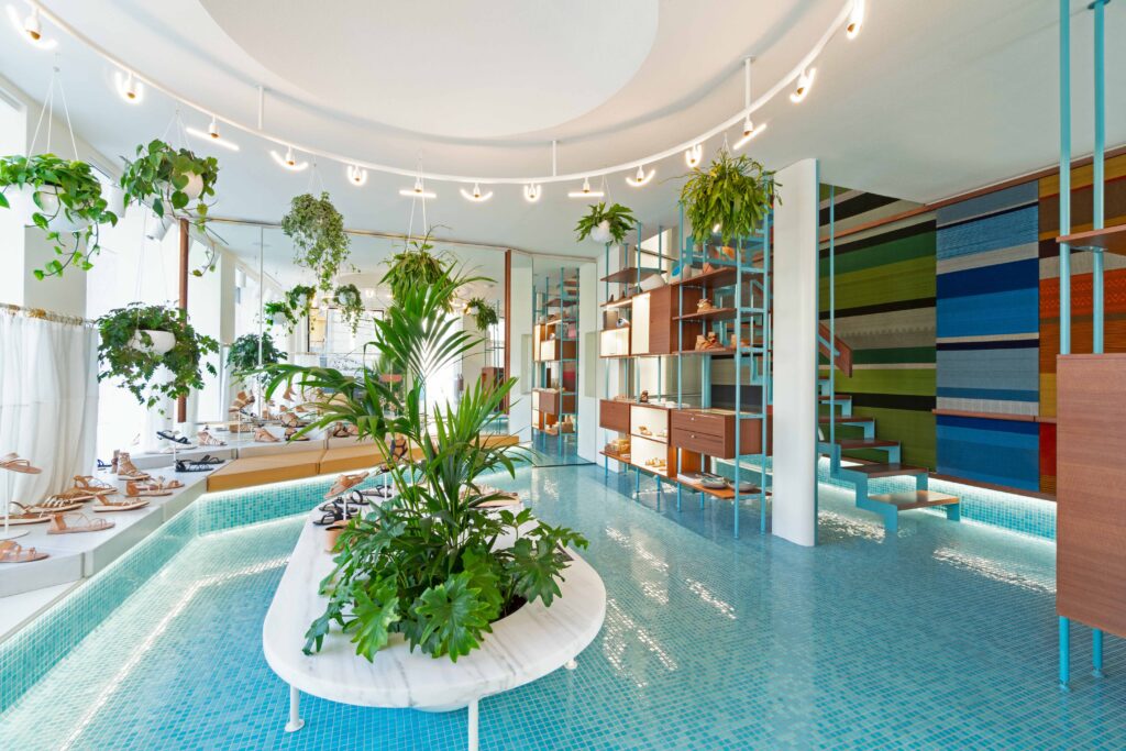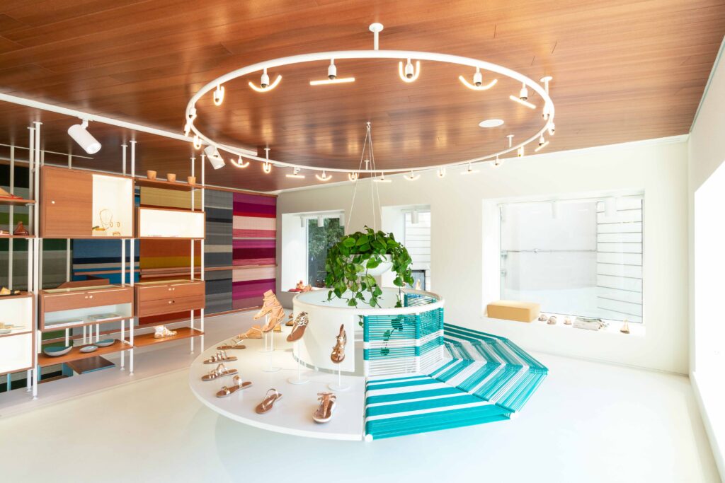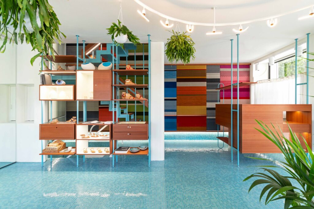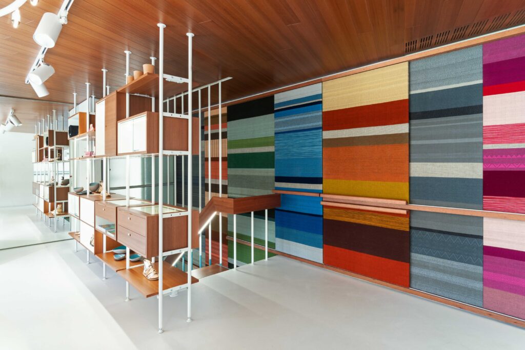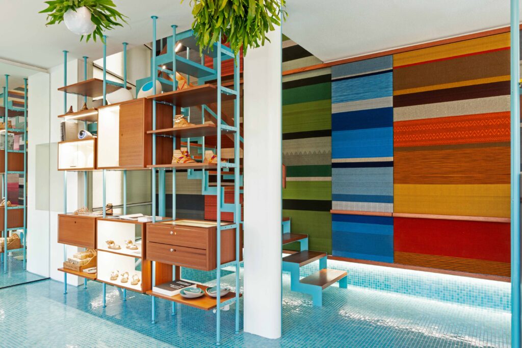 Back in 2019, A WHALES ARCHITECTS and ANCIENT GREEK SANDALS commissioned Alexandra Bissa to create a 34sqm handwoven mural, covering an entire wall from ground to first floor, for AGS’S flagship store in Athens, Greece. Alexandra designed and hand wove the mural which consists of 7 colourful stripes and various patterns, in cotton and wool. The patterns are inspired by designs found in ancient Greek pottery and a mural close up reveals their intricate details. Small but beautiful defaults during the handmade weaving process were embraced, underlying the craftsmanship’s unique touch.