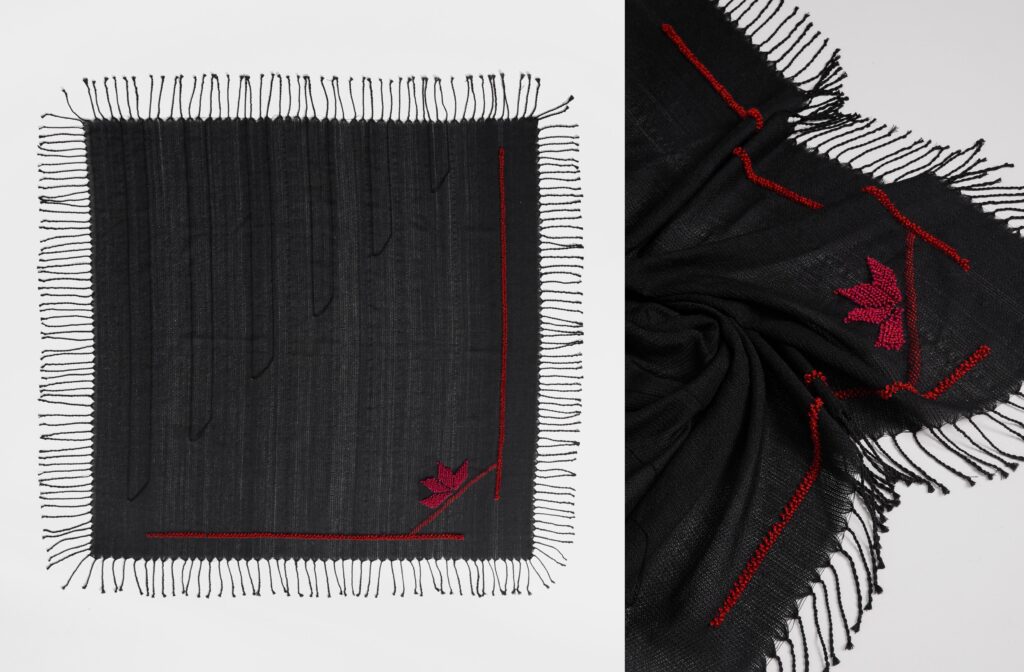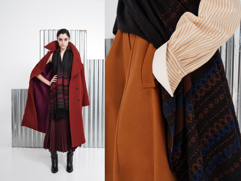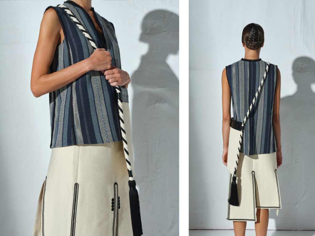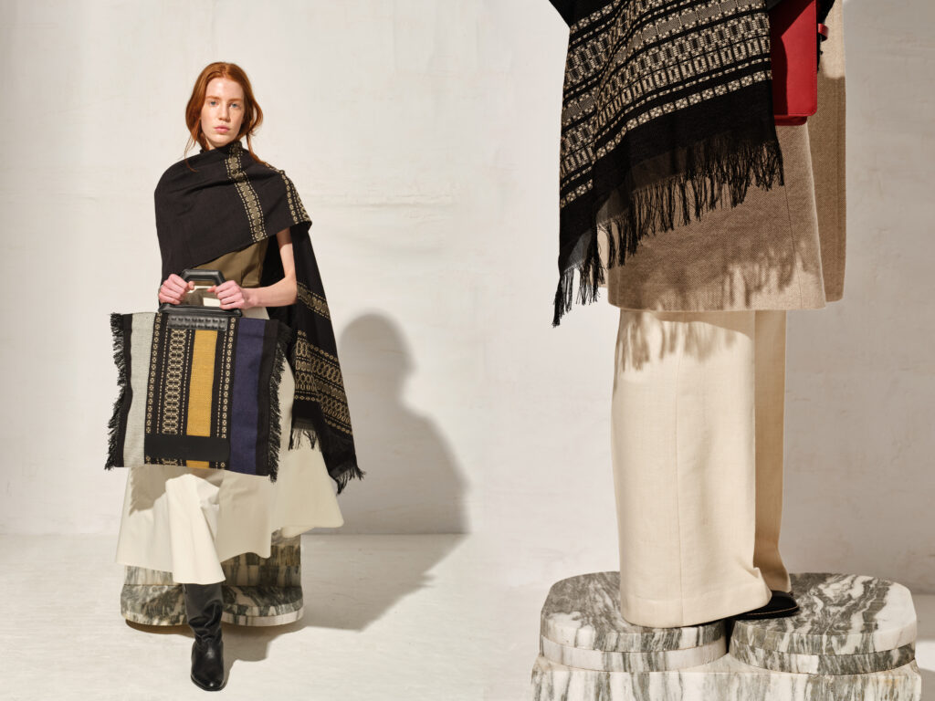 KHRAMI handloomed scarves with the brand’s signature ‘spathoto’ pattern. Woven in merino wool & cotton. MILEA bag exclusively made for AW21 Metsovo collection.