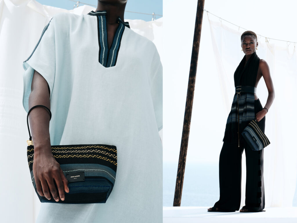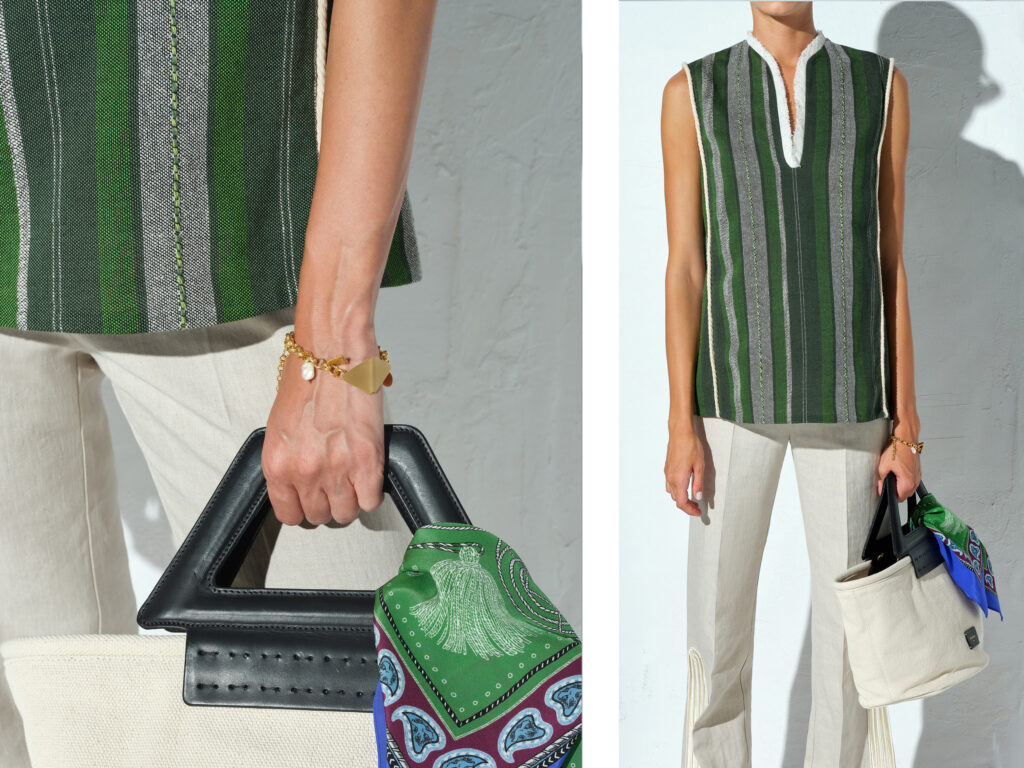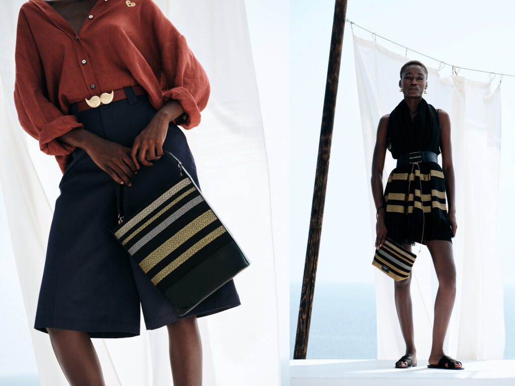 For the brand’s Mycenean collection, Alexandra was comissioned to weave fabrics with shimmering gold threads. Bucket bags, pouches, scarves and sandals were handwoven for the SS23, along with details added on Amari caftan.